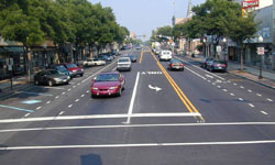 The number of lanes has been reduced and bicycle lanes have been added to this roadway.