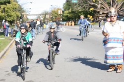 Aztec dancers performed along the route in the predominantly Mexican community of Little Village on October 26, 2008. Image: Katie Tully