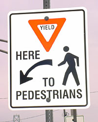 A YIELD HERE TO PEDESTRIANS sign.